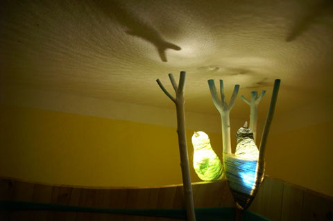 In einem 9 qm kleinen Raum sollten 10 Schlafplätze für Krippenkinder untergebracht werden. So entstand das Raumwunder mit doppelstöckigen Höhlen und zusätzlichem Stauraum für Windeln und Wechselwäsche. Die zauberhaften Vogelleuchten sorgen für ein dezentes Spiel von Licht und Schatten.